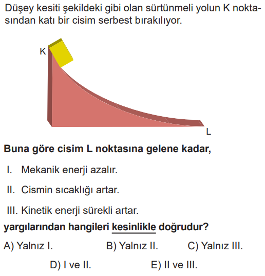 III- Potansiyel enerjinin tamamı kinetik enerjiye dönüşemez, bir kısmı ısıya dönüşür ancak kinetik enerji sürtünme kuvvetinin büyüklüğüne göre sabit kalabilir, azalabilir veya artabilir.
