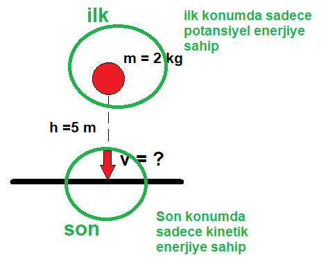 Son durumda ise yere çarpmaktadır, kinetik enerjiye sahiptir ancak yerde olduğu için bu sefer potansiyel enerjiye sahip değildir.